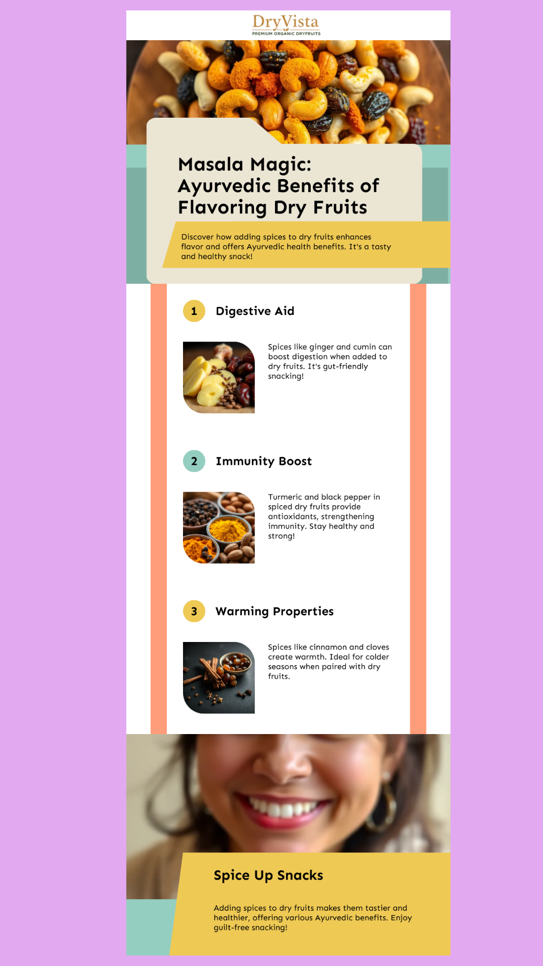 This infographic will help you explore the Ayurvedic logic containing in Keyword—the science of flavoring dry fruits for taste and health. It visually demonstrates how those spices — think turmeric, cardamom and cinnamon — serve a dual purpose, helping not only with flavor but also with digestion, immunity and energy. Viewers will discover some of the ancient Ayurvedic principles behind why nuts are paired with certain herbs for balance and vitality. Quick infographics connect each spice to its health benefits, demonstrating how the Keyword tradition blends with contemporary nutrition. The ideal resource for health enthusiasts and conscious snackers, this captivating guide simplifies the science behind satisfying flavor and good health into bites that are a pleasure to consume.