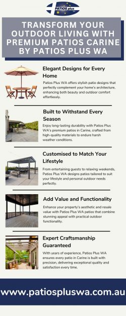 With Patios Carine by Patios Plus WA, you can turn your outdoor space into a chic and useful haven. Our skilled crew creates and installs premium patios that improve the lifestyle and value of your house. We use high-quality materials to ensure durability and beauty that endures throughout every season, regardless of your preference for modern, classic, or custom styles. All year long, you can take advantage of seamless outdoor entertaining, leisure, and comfort with Patios Carine. Put your trust in our skilled experts to design the ideal patio solution for your requirements. Call us at (+61 8 9302 1600) right now for a free quote or more information.