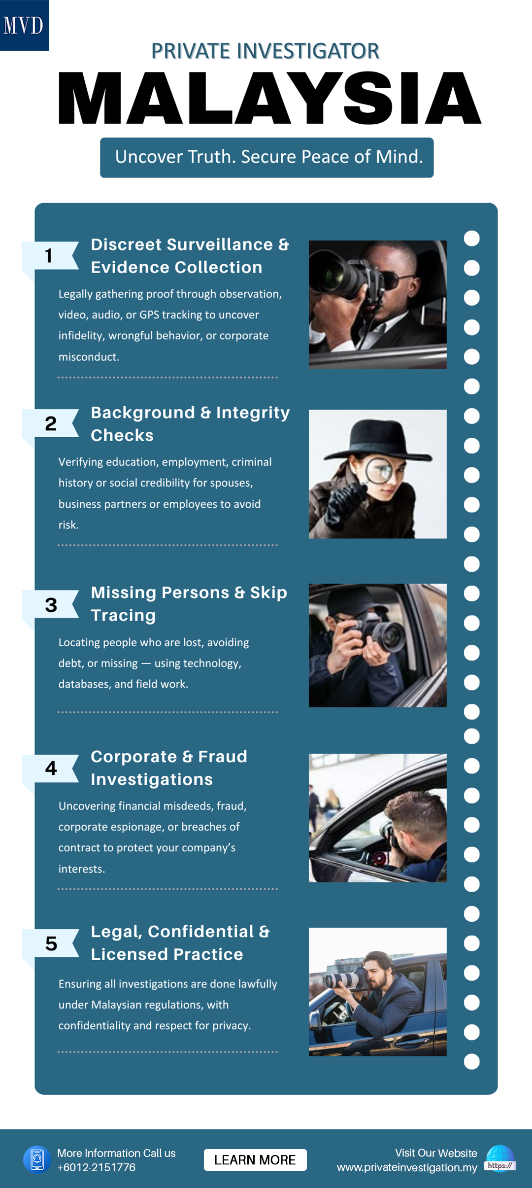 Discover the truth with Malaysia’s most trusted private investigators. Our professional team specializes in discreet, confidential, and result-driven investigations for both personal and corporate matters. From background checks and infidelity investigations to corporate fraud detection, we ensure complete accuracy and privacy. Trust Private Investigator Malaysia to bring you clarity, evidence, and peace of mind when it matters most.