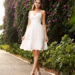 Robe de mariée bref a-ligne au niveau de genou decoration en fleur manche nulle – GoodRobe
