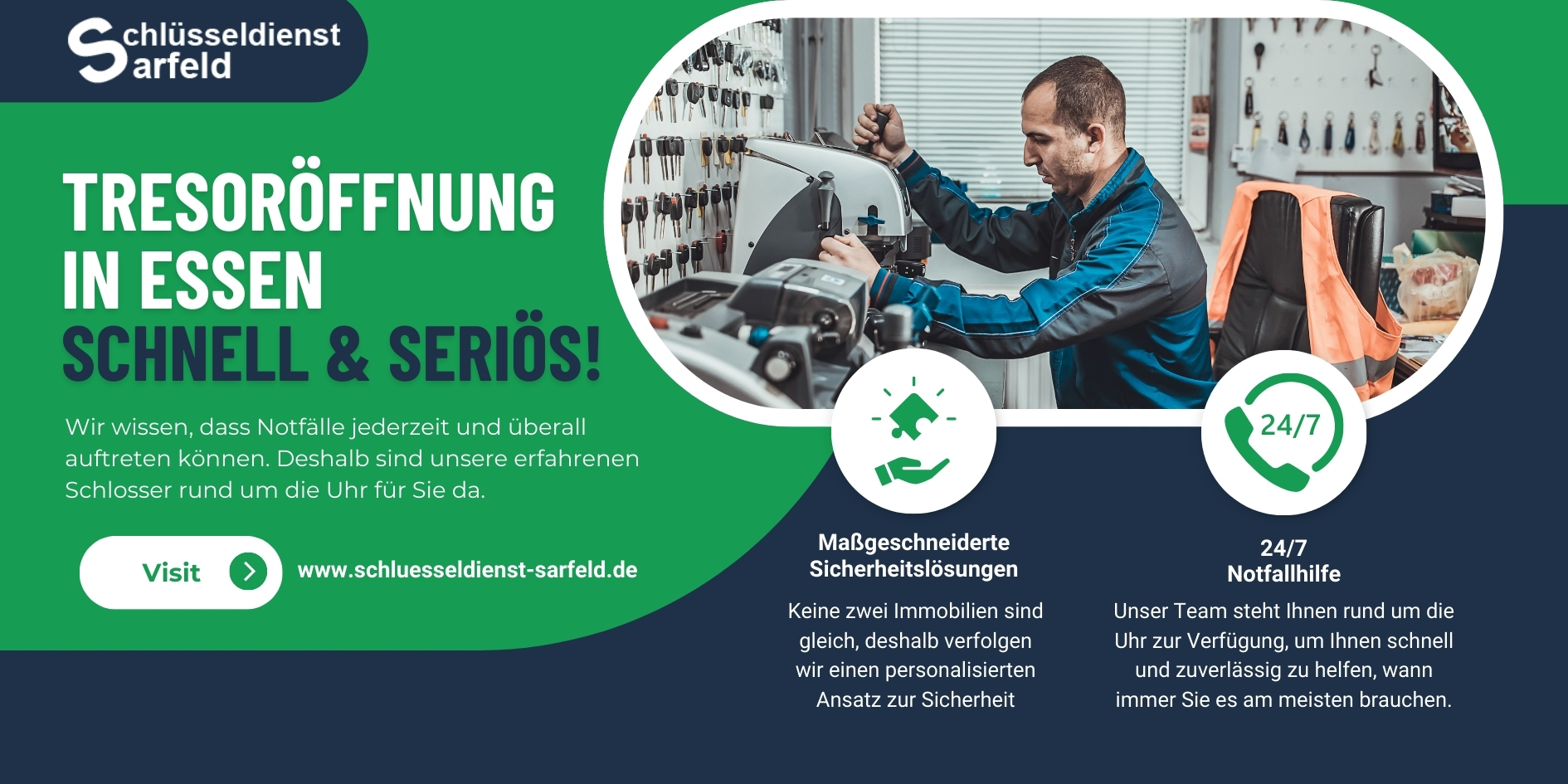 Schlüsseldienst Essen Sarfeld bietet Ihnen eine schnelle und seriöse Tresoröffnung Essen, ganz ohne Schäden. Ob Zahlencode vergessen oder Schlüssel verlieren: Unsere erfahrenen Experten sind 24/7 für Sie da. Verlassen Sie sich auf professionelle Hilfe mit fairen Preisen und diskretem Service. Jetzt anrufen und Tresor sicher öffnen lassen